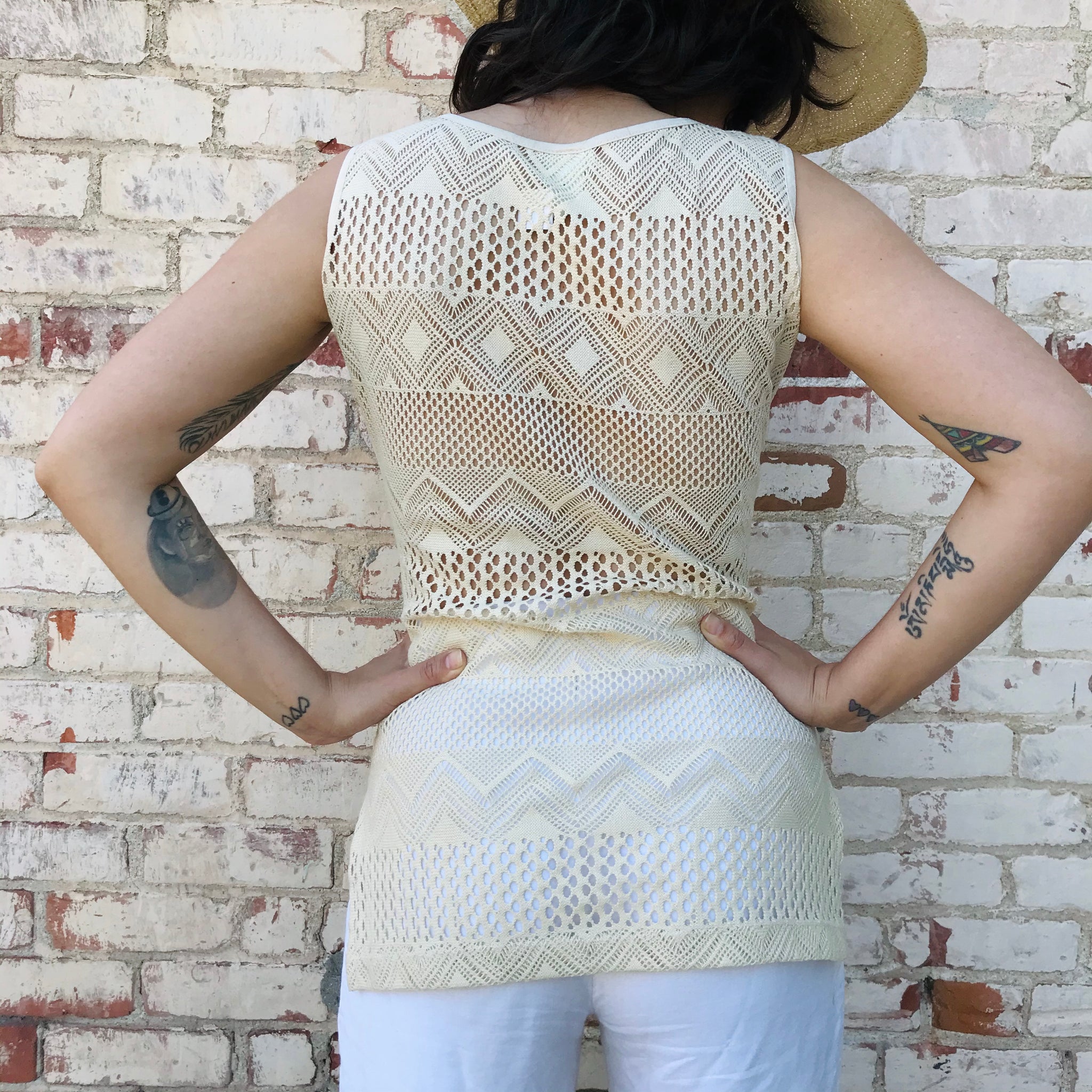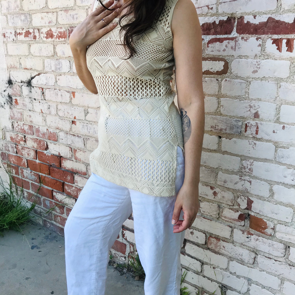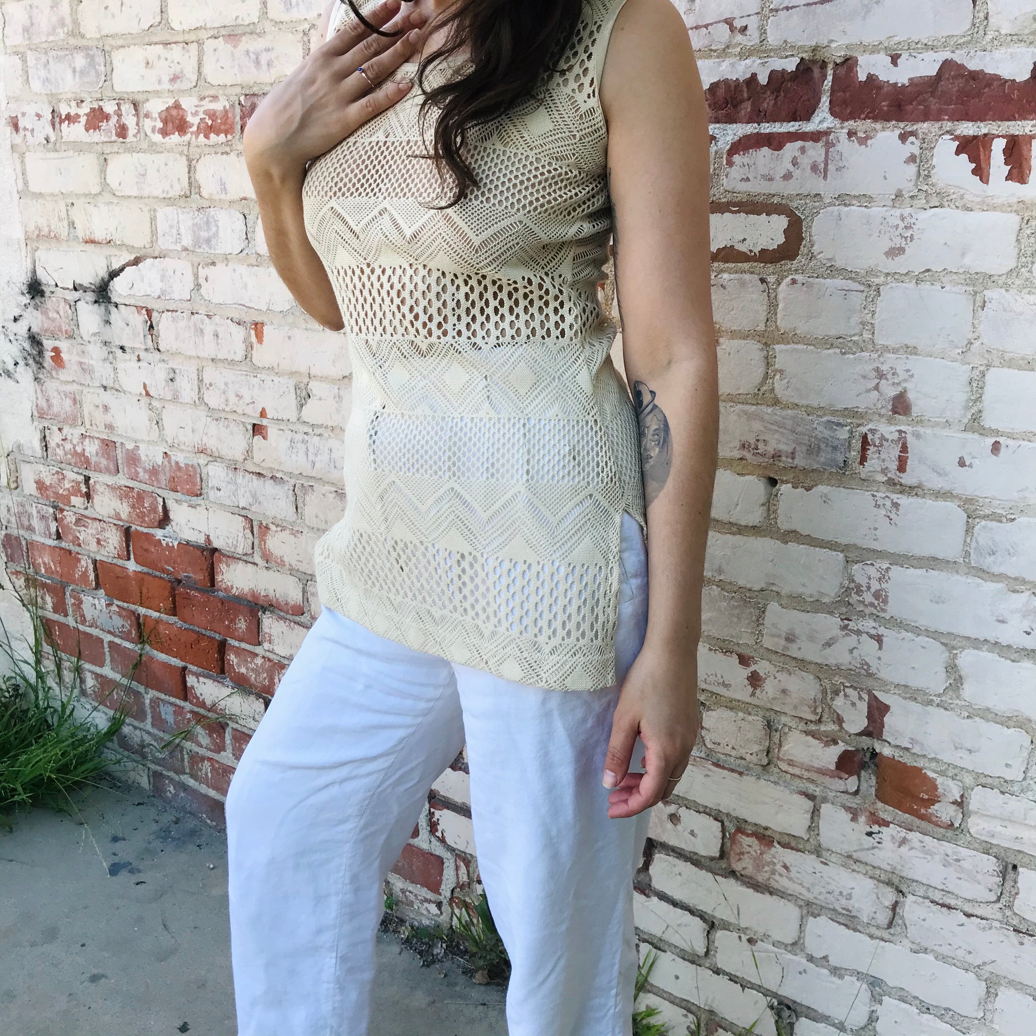 Cream knit tank coverup perfect for covering up at the beach or pool side. Gorgeous shear style with slits on side. Pair with linen pants or cutoff shorts with a bralette for a summer vibe. Don't forget the big sunglasses!